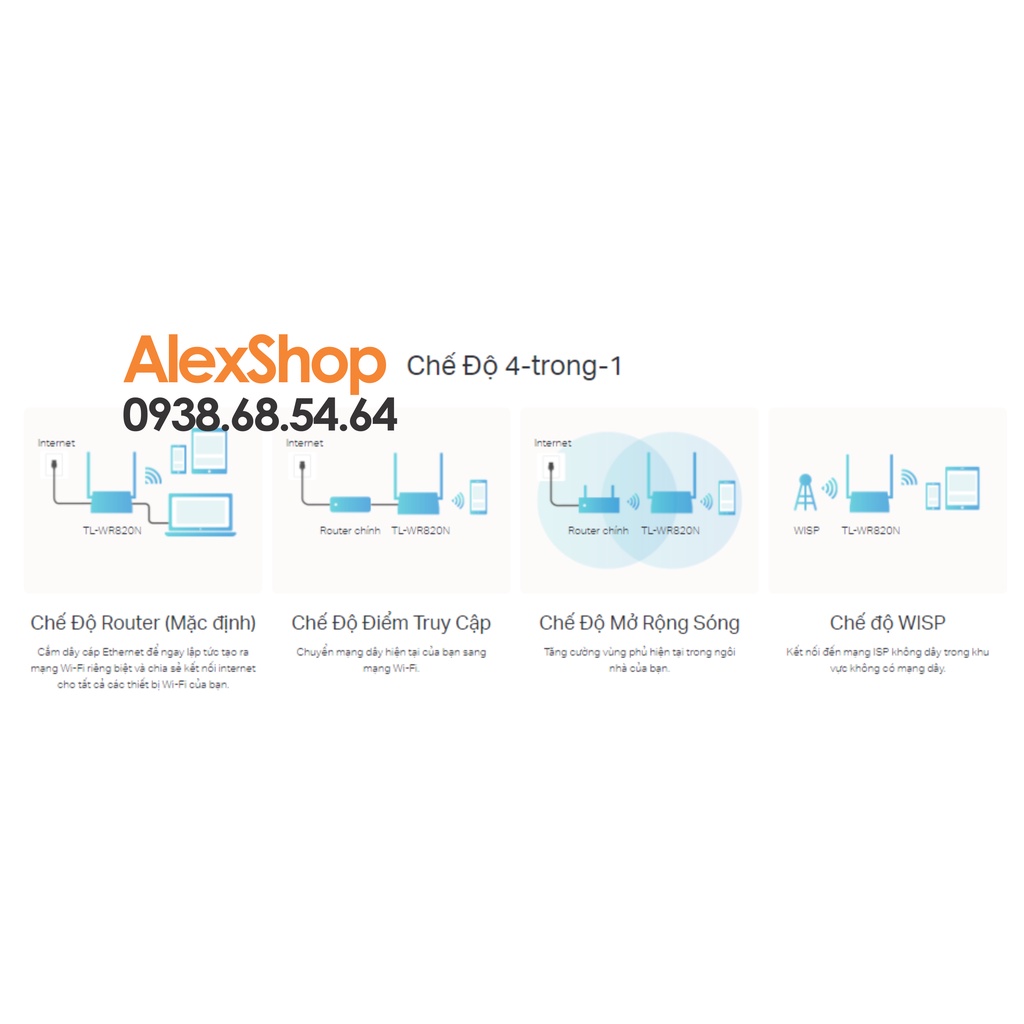👉 Chế Độ 4-trong-1: Chế Độ Router (Mặc định) Cắm dây cáp Ethernet để ngay lập tức tạo ra mạng Wi-Fi riêng biệt và chia sẻ kết nối internet cho tất cả các thiết bị Wi-Fi của bạn. Chế Độ Điểm Truy Cập: Chuyển mạng dây hiện tại của bạn sang mạng Wi-Fi. Chế Độ Mở Rộng Sóng: Tăng cường vùng phủ hiện tại trong ngôi nhà của bạn. Chế độ WISP: Kết nối đến mạng ISP không dây trong khu vực không có mạng dây.