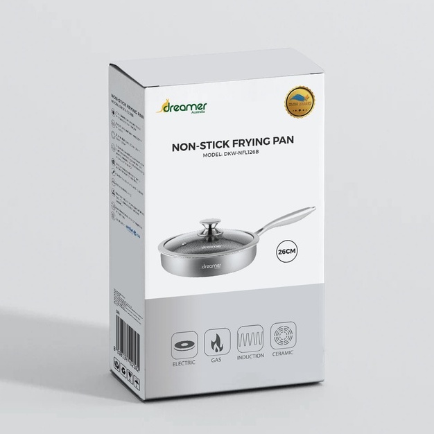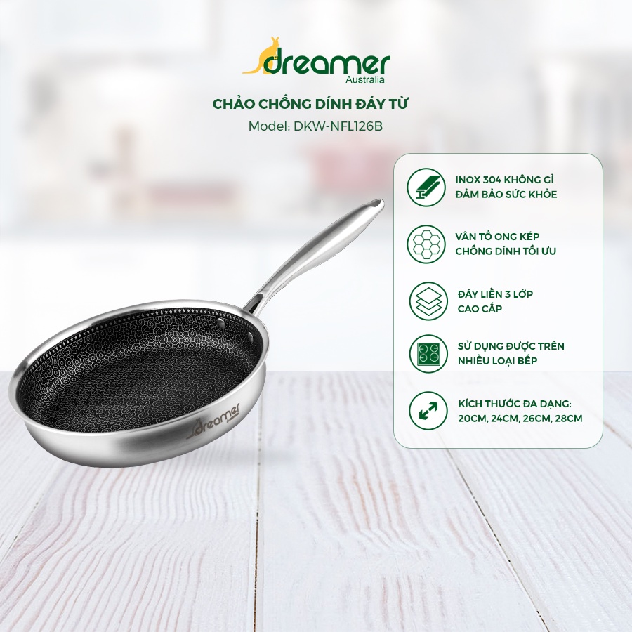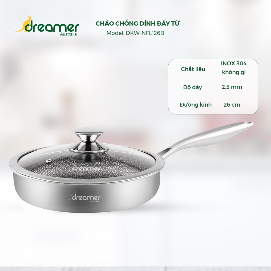 Chảo chống dính đáy từ vân tổ ong-26cm Dreamer DKW-NFL126BInox 304 không gỉ cho tuổi thọ sản phẩm cao.