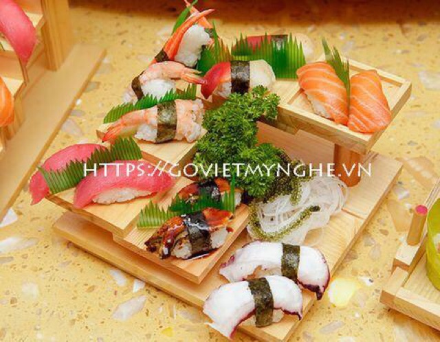 MÔ TẢ SẢN PHẨM:+ Khay gỗ bậc thang được dùng để trang trí Sushi - Sashimi trong phong cách trang trí ẩm thực Nhật Bản.