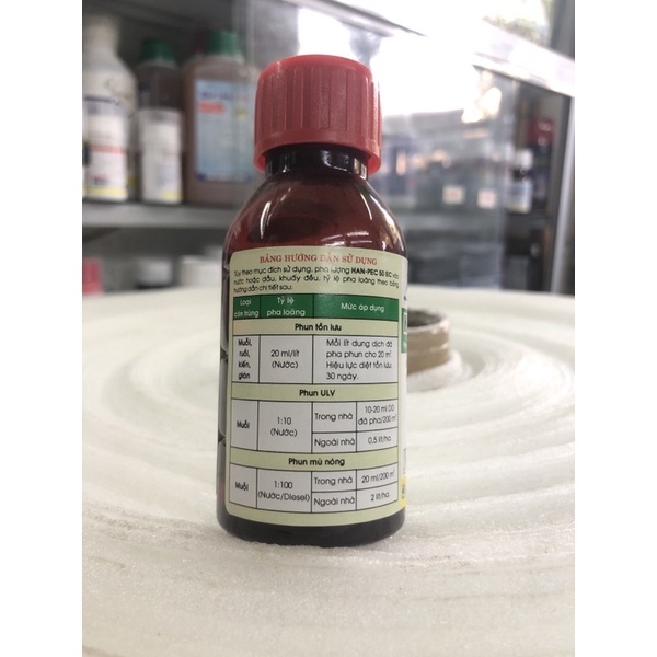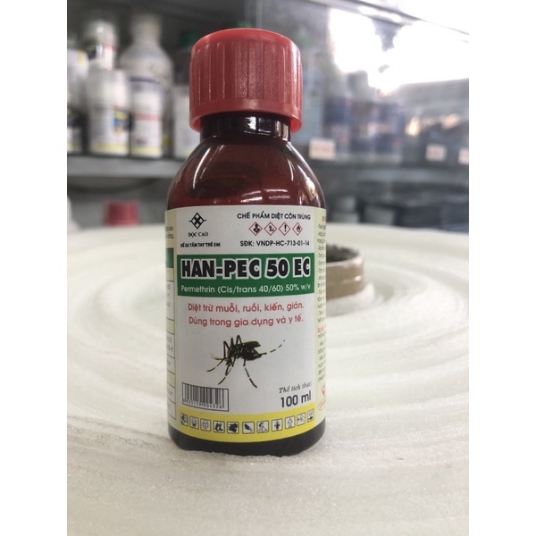 - Hướng dẫn sử dụng: Đã có trên chai Han- Pec 50EC (Pemethrin 50% w/v) là chế phẩm diệt côn trùng nhóm cúc tổng hợp dạng nhũ dầu đậm đặc, diệt trừ hiệu quả các loài côn trùng gây bệnh: sốt rét, sốt xuất huyết, viêm não Nhật Bản, sốt thương hàn… Han- Pec 50EC ít độc trên người và động vật có máu nóng.