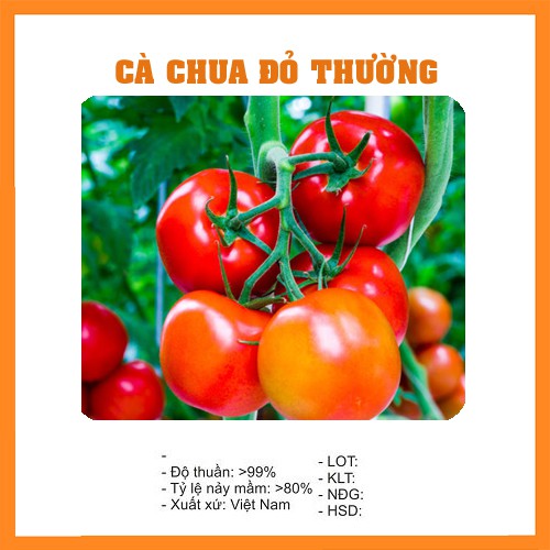 Hạt giống cà chua thường có xuất xứ từ Việt Nam là sản phẩm được thu hoạch trực tiếp, sàng lọc phân loại hạt tốt nhất nhưng không phải hàng F1. Đây là giống cà chua thông thường chúng ta vẫn hay mua, ăn mà có thể tìm thấy ở bất kỳ cửa hàng, chợ nào của Việt Nam* THÔNG TIN SẢN PHẨM