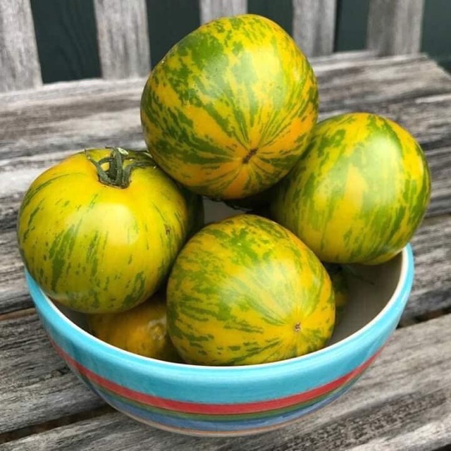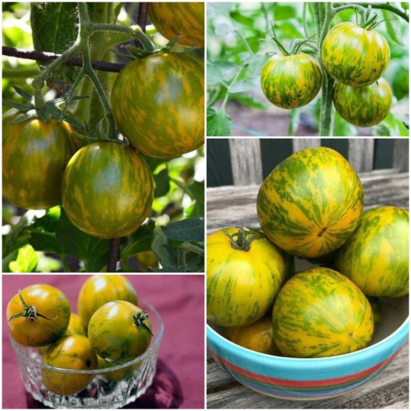 Đặc điểm: Zebra Tomato là loại cà chua cherry đặc biệt, có vằn sọc nằm dọc theo quả. Thuộc dạng cây bán bụi, chiều cao tối đa 2m, quả mọc theo chùm 5-7 trái/ chùm