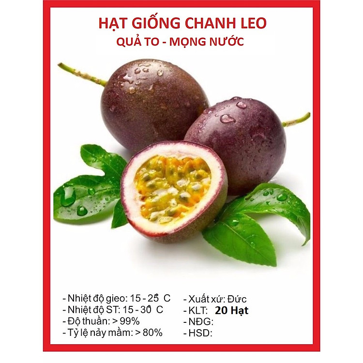 Hạt Giống Cây Chanh Leo - Trái To Mọng- Số hạt/gói: 20 Hạt- Tỷ lệ nẩy mầm: >80%- Mùa Vụ: Quanh năm- Nhiệt độ gieo: 15 - 25 độ- Nhiệt độ ST: 10 - 35 độ- Thời gian ra hoa: 90 - 100 ngày- Xuất ...- Giao hàng toàn quốc