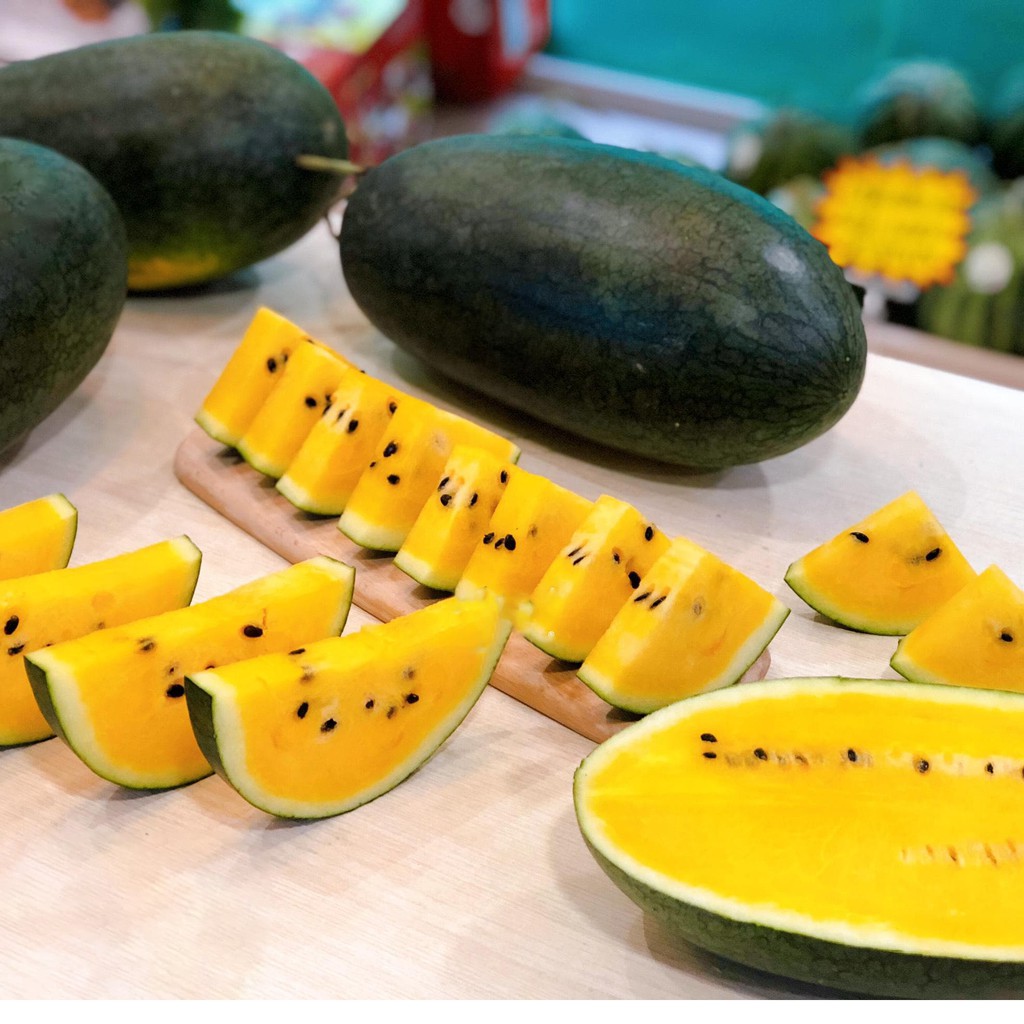 Đặc điểm: Hạt giống dưa hấu ruột vàng có hương vị thơm ngon, ngọt, da quả màu xanh sáng, có sọc mờ, vỏ quả mỏng, dai, cứng, ít dập vỡ khi vận chuyển đi xa. Thịt quả màu vàng ăn vịt ngọt đậm, ít hạt, ăn không chảy nước như các loại dưa hấu ruột đỏ khác. Trọng lượng quả nặng trung bình 3 - 4 kg/quả. Giống có khả năng kháng bệnh tốt đặc biệt là với bệnh nứt thân và chạy dây.