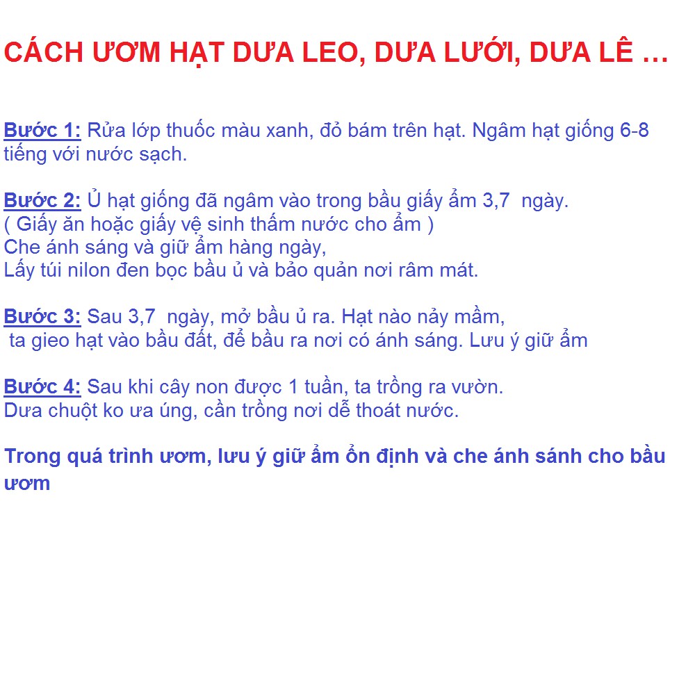 Ươm hạt dưa lê rất đơn giản, bạn chỉ cần cho hạt vào bầu, đầu nhọn xuống dưới, tưới đẫm nước để vào chỗ mát 1-2 hôm nảy mầm, không cần tưới nhiều hạt sẽ úng không nảy mầm được. Đất ươm hạt nên dùng đất trộn phân trùn hoặc phân chuồng để có đủ dinh dưỡng cho cây con khỏe mạnh. Khi cây có lá thật thì mang trồng vào thùng, chậu.