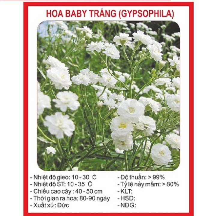 Hạt giống hoa Baby trắng gói 50 hạt xuất xứ ĐứcHoa Baby hay còn gọi là Hoa Chấm bi xuất xứ từ vùng Địa Trung Hải và Đông Âu, Baby (Baby’s Breath) là tên của những hoa thơm nhỏ xíu như những bông tuyết. Là cây thân thảo lâu năm, hoa nhiều li ti, màu trắng rất xinh, có thể cắt hoa để cấm lãm hoa, chăm sóc đơn giản, chỉ cần tưới đầy đủ là cây phát triển tốt, ưa khí hậu mát mẻ.Hoa Baby hay còn gọi là Hoa Chấm bi xuất xứ từ vùng Địa Trung Hải và Đông Âu, Baby (Baby’s Breath) là tên của những hoa thơm nhỏ xíu như những bông tuyết. Là cây thân thảo lâu năm, hoa nhiều li ti, màu trắng rất xinh, có thể cắt hoa để cấm lãm hoa, chăm sóc đơn giản, chỉ cần tưới đầy đủ là cây phát triển tốt, ưa khí hậu mát mẻ.