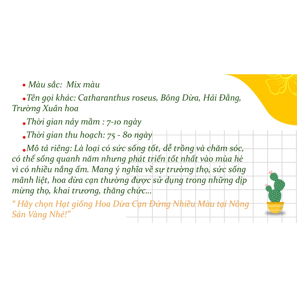 Nhà cửa & Đời sống > Làm vườn > Hạt giống & chất hỗ trợ trồng cây || Hạt giống Hoa Dừa Cạn Đứng Nhiều Màu ( Gói 50 Hạt ) - Nông Sản VàngCòn hàng