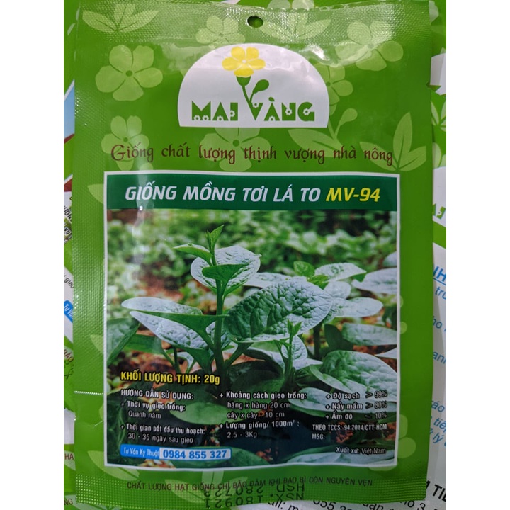 Hạt giống mồng tơi lá to 20g. Cả 2 thương hiệu Rạng Đông hoặc Mai Vàng đồng giá và chất lượng quý khách yên tâm-Lá to, dày, cọng to