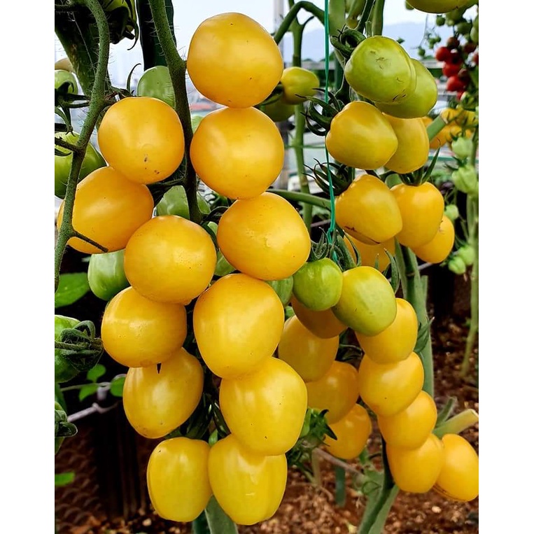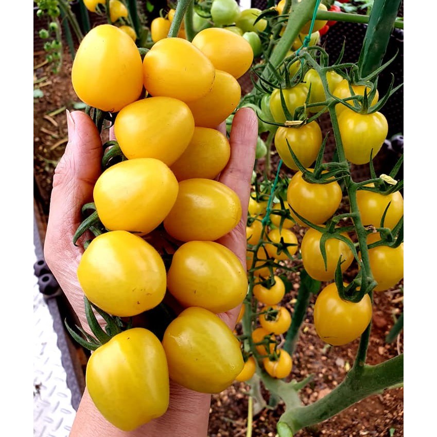 🌱 Đặc tính: quả màu vàng, rất ngọt và thơm, không bị đậm mùi cà chua, ăn sống siêu ngon. Quả ra theo chùm dây, 1 dây từ 20-30 quả, form quả giống như quả dâu vàng. Cây không chịu được bóng râm và khô hạn, trồng ở vị trí có nắng ít nhất 7-8 tiếng/ngày