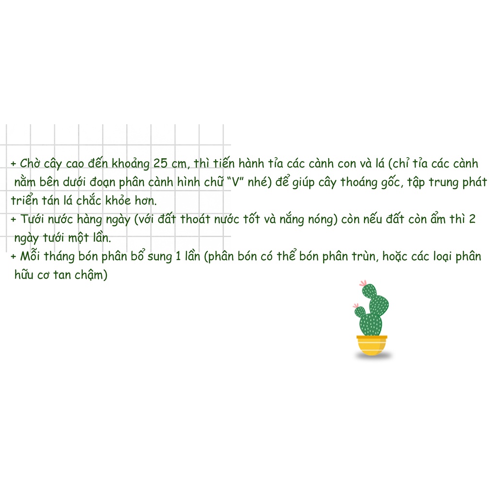 + Chờ cây cao đến khoảng 25 cm, thì tiến hành tỉa các cành con và lá (chỉ tỉa các cành nằm bên dưới đoạn phân cành hình chữ “V” nhé) để giúp cây thoáng gốc, tập trung phát triển tán lá chắc khỏe hơn.