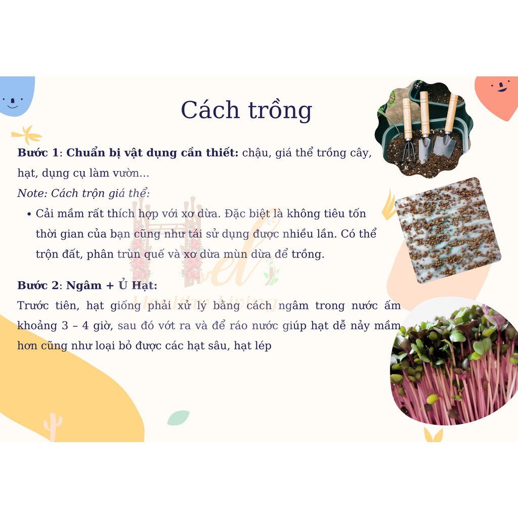 – Giá thể: Cải mầm rất thích hợp với xơ dừa. Đặc biệt là không tiêu tốn thời gian của bạn cũng như tái sử dụng được nhiều lần. Có thể trộn đất, phân trùn quế và xơ dừa mùn dừa để trồng.