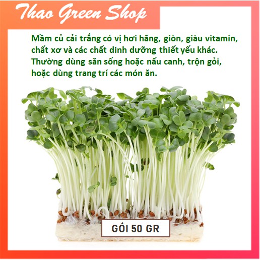 Hạt Giống Rau Mầm Củ Cải Trắng 50grRau mầm củ cải là cây thân nhỏ, khi thu hoạch cao chừng 5-7cm, thường dùng săn sống hoặc nấu canh, trộn gỏi, hoặc dùng trang trí các món ăn. Rau mầm củ cải là cây có vị hơi hăng, giòn, giàu vitamin và các chất dinh dưỡng thiết yếu. Không những thế rau mầm củ cải còn cung cấp nhiều chất xơ giúp quá trình bài tiết dễ dàng hơn.