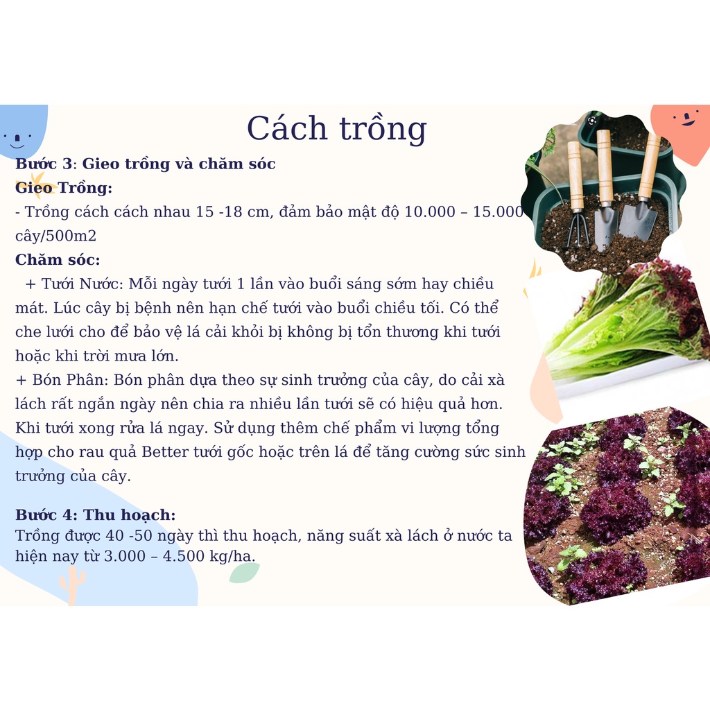 Trồng được 40 -50 ngày thì thu hoạch, năng suất xà lách ở nước ta hiện nay từ 3.000 – 4.500 kg/ha.