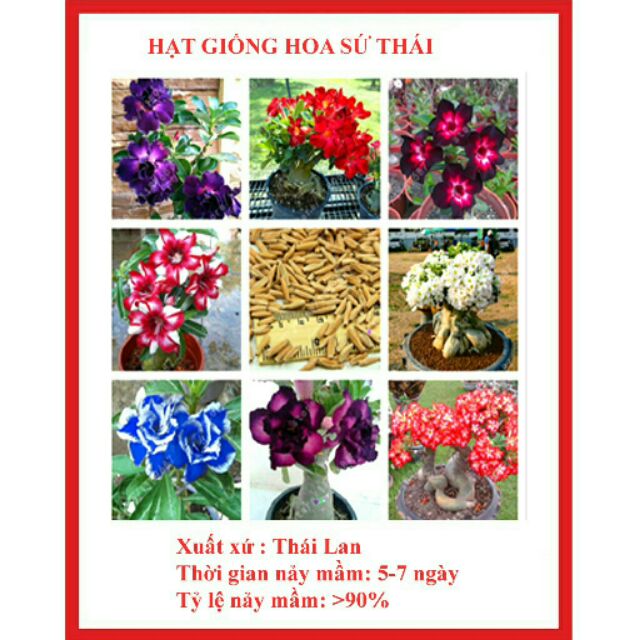 Hạt giống : sứ thái kép là nhiều cánh trên 1 bông.Sứ thái có màu sắc rất đa dạng,cây rất dễ sống,ít tốn công chăm sóc,cây cho hoa quanh năm.