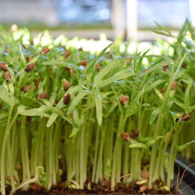 Bước 4: Sau vài ngày ủ trong bóng tối bạn sẽ thấy rau bắt đầu nhú mầm, lúc này, nếu các lá mầm có màu vàng thì bạn cũng đừng quá lo lắng. Bước tiếp theo trong quy trình trồng rau mầm lúc này là phải mang rau ra ánh sáng, màu vàng của lá mầm sẽ nhạt bớt và dần chuyển thành màu xanh, rau cũng sẽ lớn nhanh hơn nhiều. Bạn vẫn tiếp tục tưới nước hàng ngày như cũ, sau khoảng 7 ngày là bạn có thể tiến hành thu hoạch thành phẩm, kế thúc quá trình trồng rau mầm tại nhà của mình.