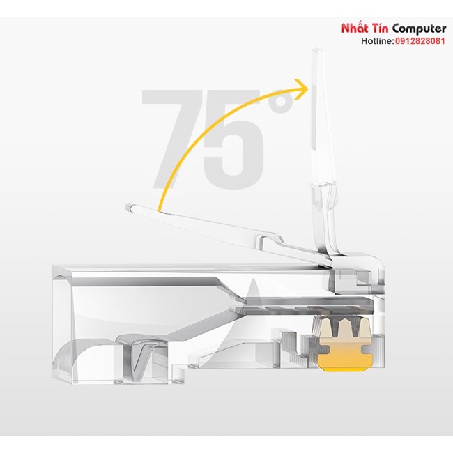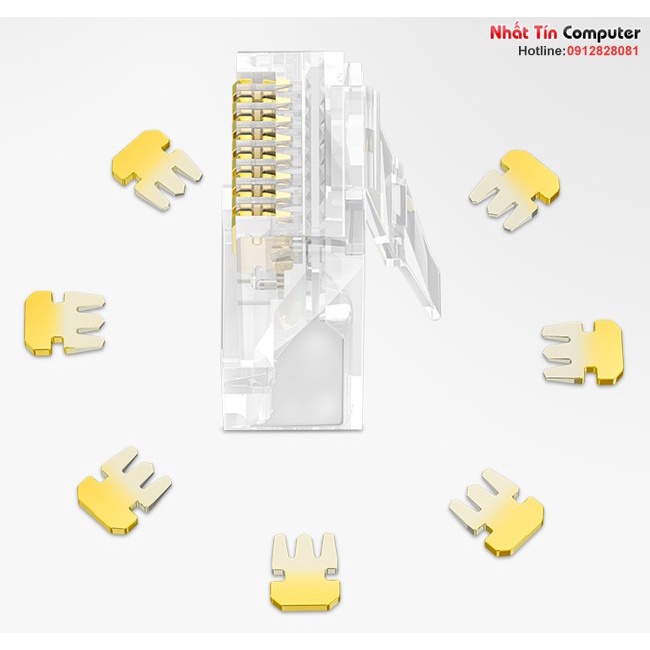 - Hạt mạng Cat6 Ugreen làm từ nhựa trong dẻo, chân tiếp xúc từ đồng nguyên chất, đầu nối mạ vàng 24K chống rỉ.