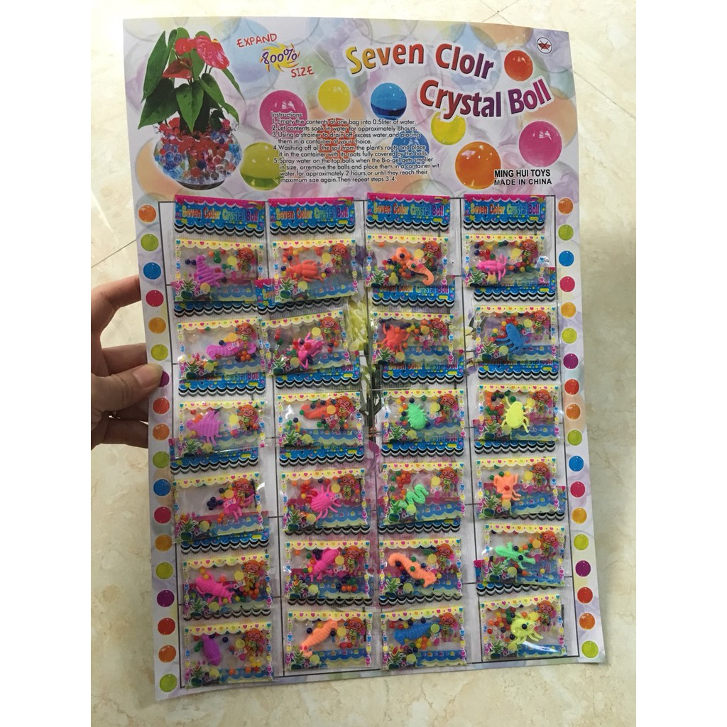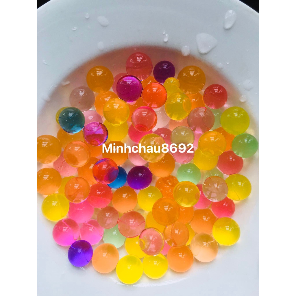 - Các nơi bán khác gọi nó là hạt trân châu trồng hoa. Sau khi ngâm vào nước khoảng 5-7h nó có khả năng lớn lên từ 100 -200 lần kích thước ban đầu, bạn nên cho nó vào ly, chậu bằng thủy tinh sẽ rất đẹp, long lanh, trong suốt, đầy màu sắc.
