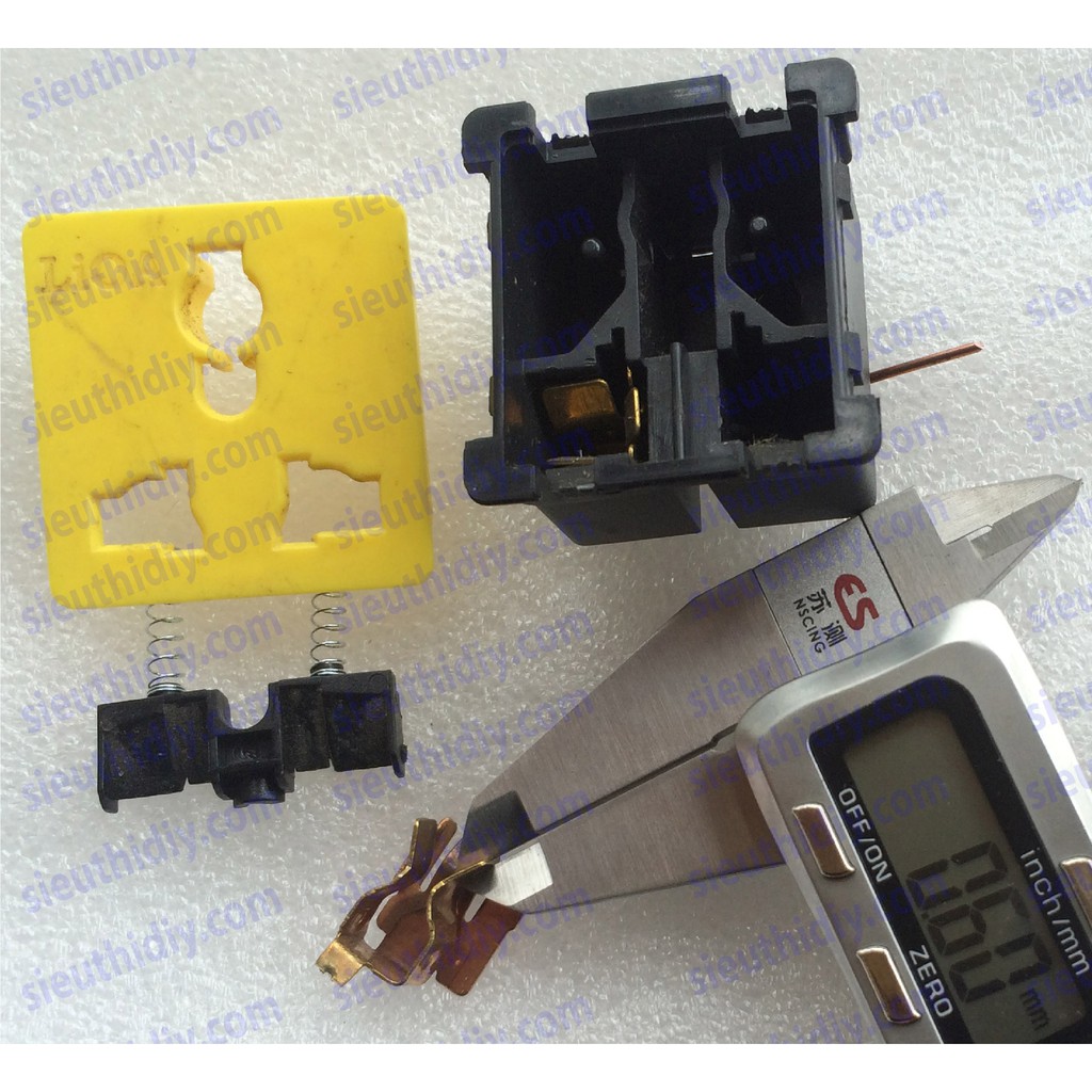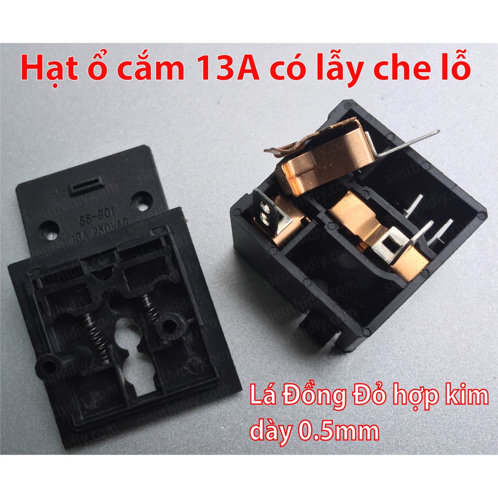 + 13A nắp che: có lẫy nhựa tự che 2 lỗ chính của ổ khi rút phích cắm. Đồng phốt pho ( hợp kim đồng đỏ dẫn điện tốt hơn đồng vàng nhiều, không dễ oxy hoá như đồng đỏ nguyên chất ) dầy 0.5mm.