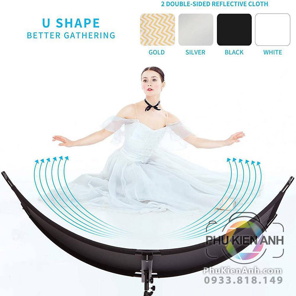 hắt sáng selens cong 180*60cm 4 trong 1. Có 5 loại bạc, vàng, trắng, đen, soft mền xuyên sáng. Thiết kế để cầm nhẹ nhàng và dễ xếp hơn.Xếp gọn dễ dàng, nhẹ nhàng mang xách.