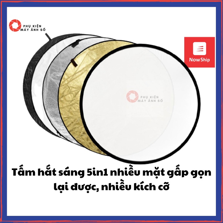 Hắt sáng 5 in 1 có 5 mặt gồm đen, trắng, bạc, vàng và xuyên. Dùng cho chụp ảnh ngoại cảnh hoặc trong phòng chụp hắt ánh sáng vào đối tượng, cân bằng vùng sáng cho chủ thể.