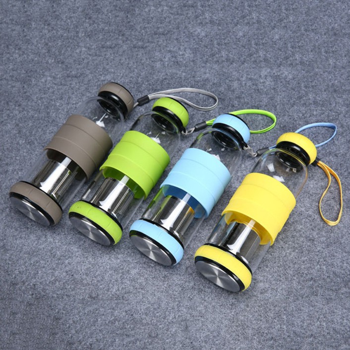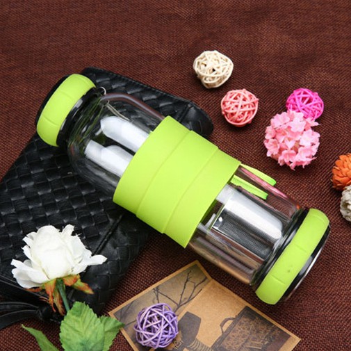 Bình nước thủy tinh 550ml cao cấp, chống trầy sướt, ố vàng, chịu nhiệt đến 150 độ, phần đáy có lưới lọc bằng thép không gỉ, pha trà, cà phê- Kích thước: 24.2cm x 7cm