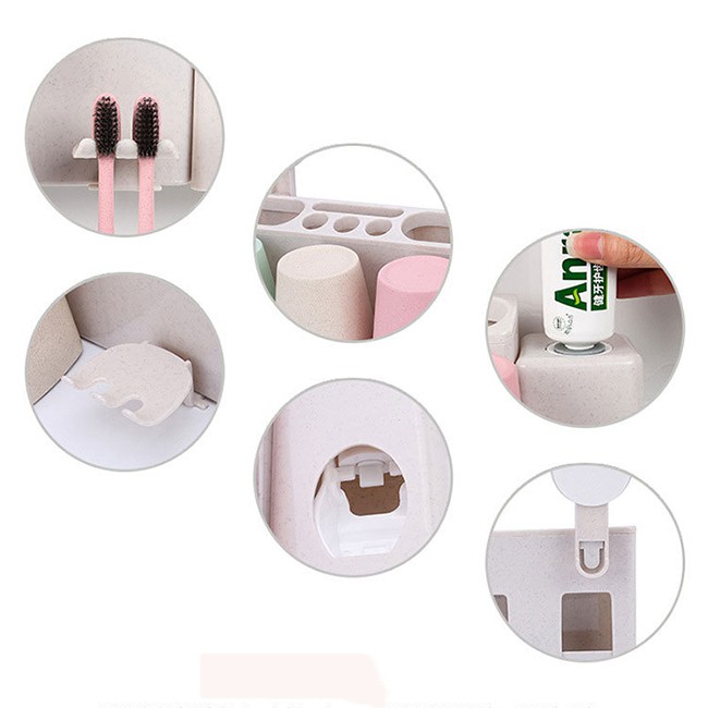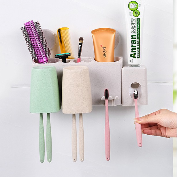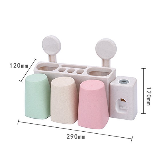 HCM - Bộ 3 bàn chải, cốc lúa mì và giá treo bàn chải, nặn kem đánh răng