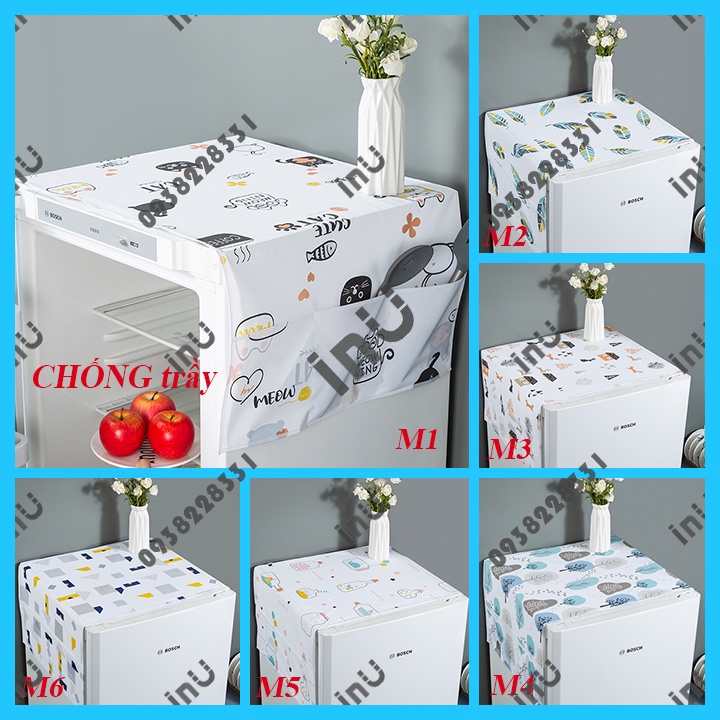 HCM - Khăn phủ tủ lạnh 4 mẫu chống bám bụi bẩn kèm ngăn để đồ bếp