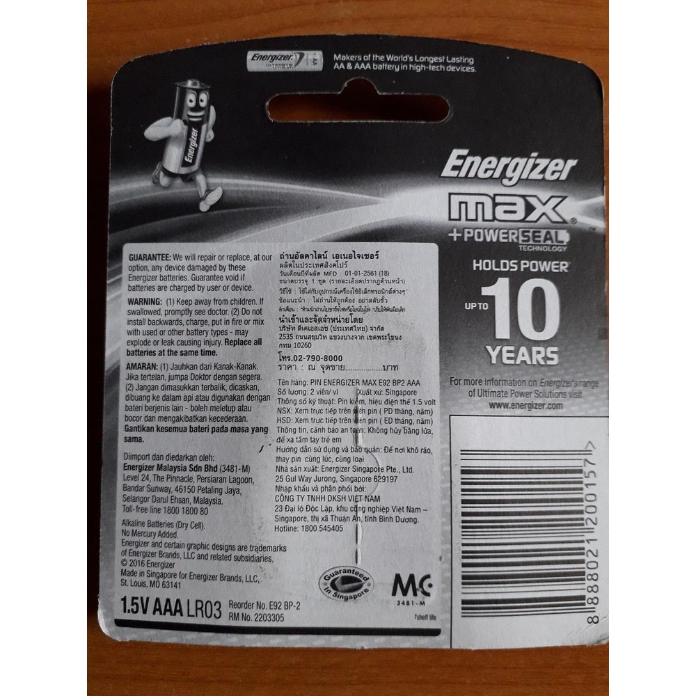 - Thời gian lưu trữ của pin lên đến 10 năm mà không bị giảm hiệu điện thế.Pin Energizer cho hiệu quả sử dụng cao tiết kiệm kinh tế và an toàn hơn các loại pin thông thường. Pin Energizer sử dụng vật liệu mới chiết xuất điện nhiều hơn ,cung cấp hiệu suất điện cho thiết bị vượt trội hơn so với các loại pin có cùng điện áp.