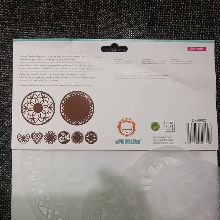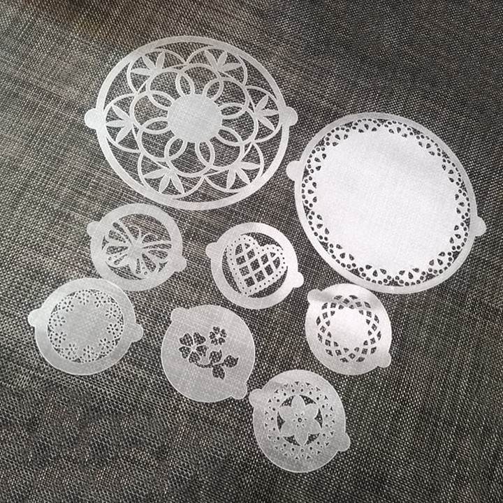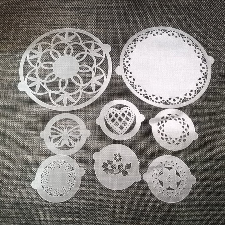 Giới thiệu HCM - Set 8 tấm rắc bột nhựa Stencil trang trí bánh ly cà phê hình viền ren tim ren