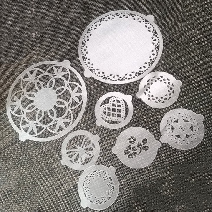 HCM - Set 8 tấm rắc bột nhựa Stencil trang trí bánh ly cà phê hình viền ren tim ren