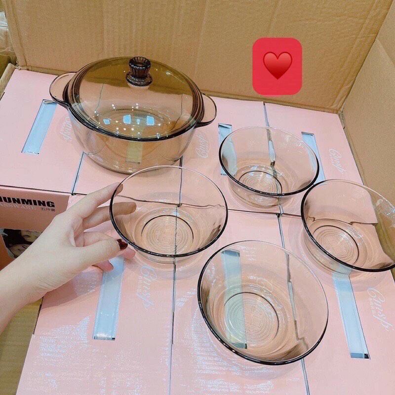 [ HCM SIÊU DÀY ] Bộ Chén Bát Thủy Tinh Chunming Cao Cấp Chịu Nhiệt và Cường Lực, Bao gồm 5 Bộ Sản Phẩm 1 Nồi và 4 Bát