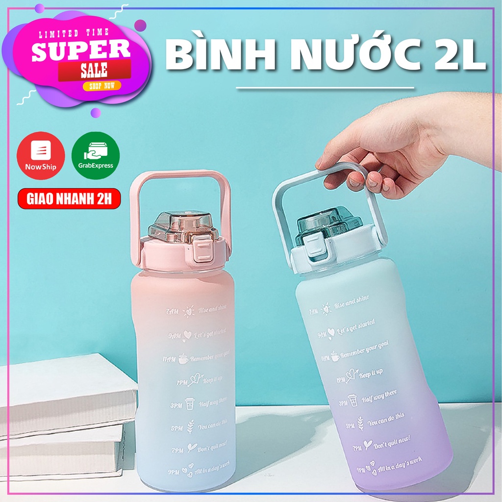 [HCM TẶNG STICKER] Bình đựng nước 2L dễ thương chia vạch báo giờ nhắc uống nước TẶNG KÈM ỐNG HÚT