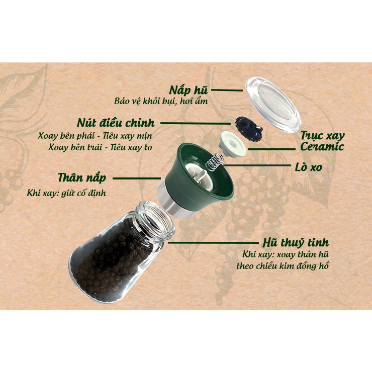 - Khi cần sử dụng tiêu, chỉ cần xoay nắp là các hạt tiêu bên trong sẽ được xay nhỏ và bạn chỉ việc rắc tiêu lên món ăn.