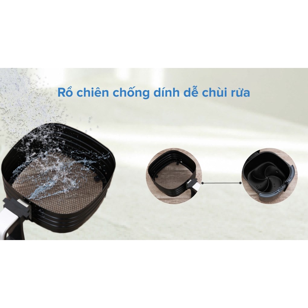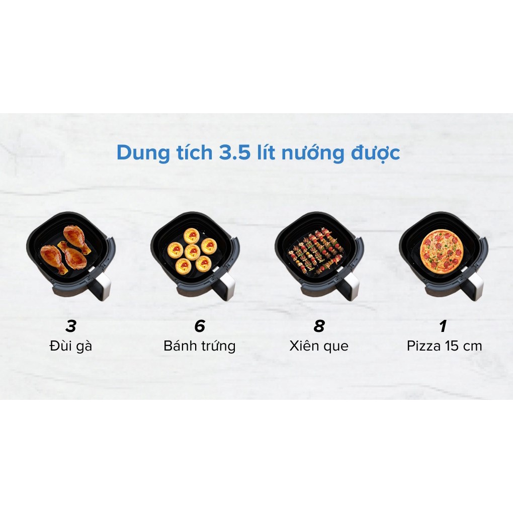 - Dung tích sử dụng 3.5 lít chiên nướng thực phẩm tiện lợi, có thể chiên được 1.5 kg khoai tây, gà nguyên con cho gia đình 6 thành viên sử dụng.