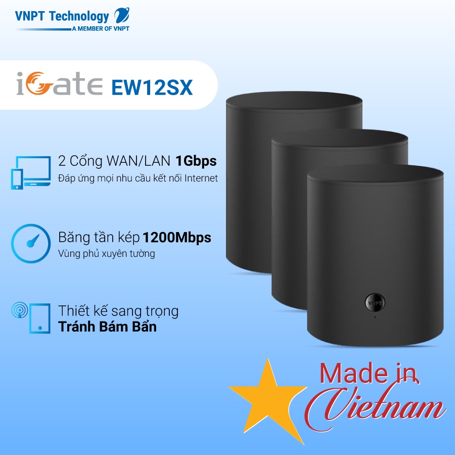 Máy tính & Laptop > Thiết Bị Mạng > Bộ Phát Wifi || Hệ thống Wifi Mesh VNPT Technology (3-pack) Chuẩn AC 2 băng tần dành cho gia đình iGate EW12SXCòn hàng