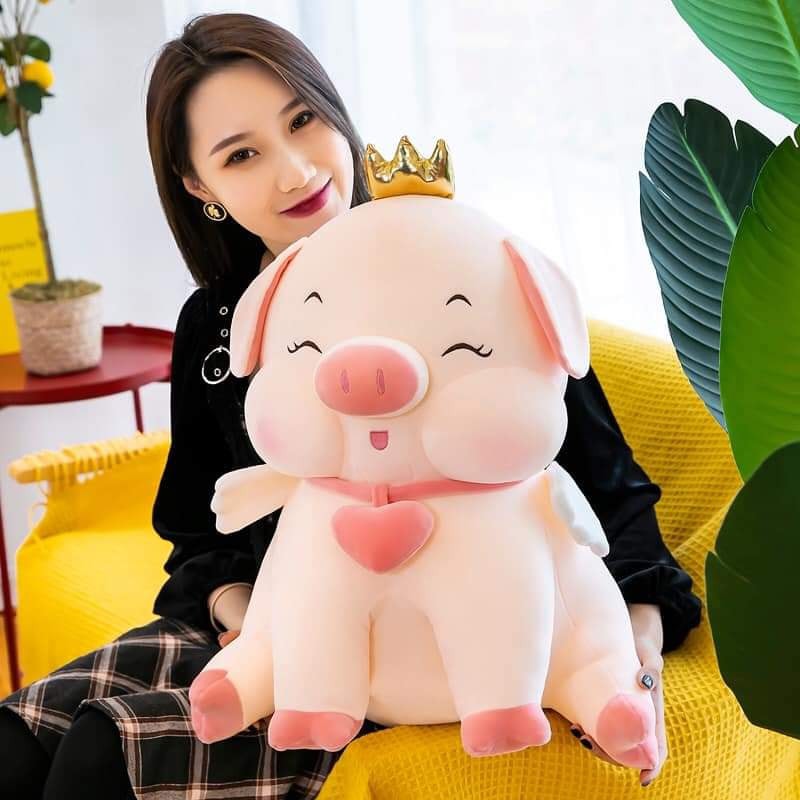 Giới thiệu Heo Bông Ngồi Đầu Đội Vương Miện Đeo Chuông Tim, Lợn Bông Ngồi Mềm Mịn Siêu Đáng Yêu gấu bông cao cấp cho bé