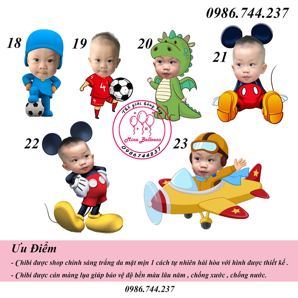- Thiết kế chibi không đơn giản chỉ là cắt mặt bé ghép vào các mẫu. Mà phải chỉnh ảnh bé cho nét, mặt trắng, khử vàng, khử các màu cho ảnh sáng đều nhau, hài hòa với màu da của chibi . Shop chỉnh ảnh bé rất kĩ lưỡng rồi mới in ra thì sẽ được 1 chibi đẹp ạ .