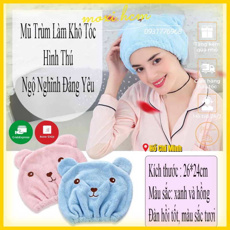 - Khăn mũ trùm đầu khô tóc hình gấu 26cm làm khô tóc sau tắm thấm hút tốt giúp bạn lau khô tóc một cách nhanh chóng.