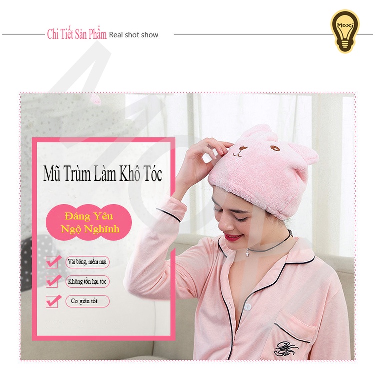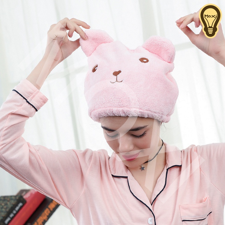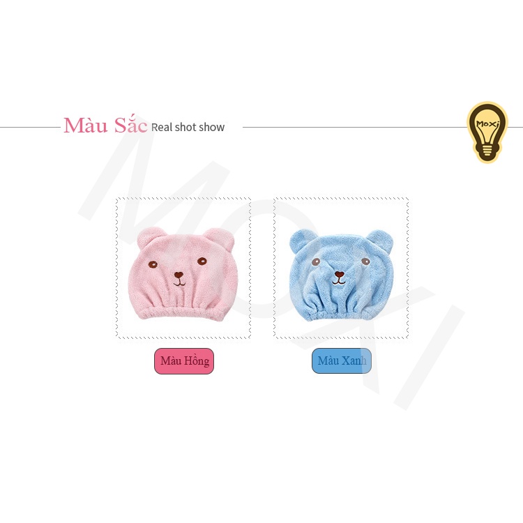 ⚡HÌNH GẤU⚡ Khăn Mũ Trùm Đầu Cotton Làm Khô Tóc Siêu Thấm Hút Sau Khi Tắm tiện dụng MOXI.