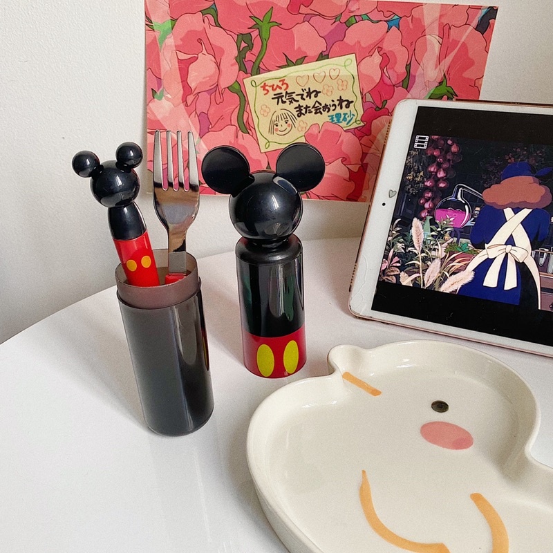 (Hình thật/Có sẵn) Bộ muỗng nĩa và Ống đựng Mickey