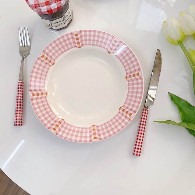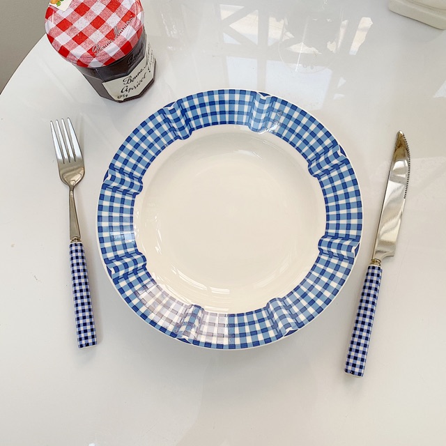 Nhà cửa & Đời sống > Bộ đồ bàn ăn > Dĩa || (Hình thật/Có sẵn) Đĩa sâu lòng hoạ tiết viền Caro Xanh HồngCòn hàng