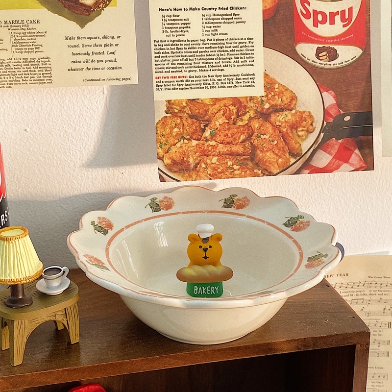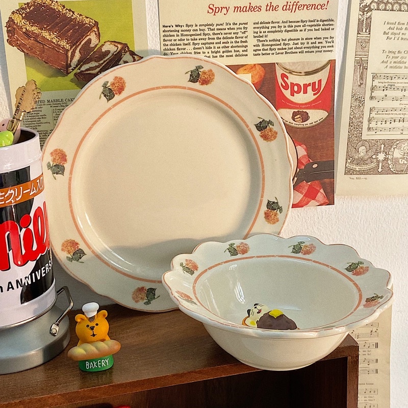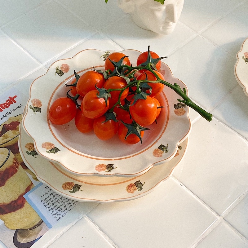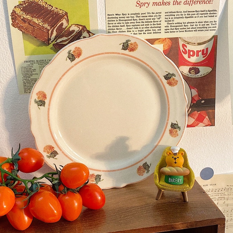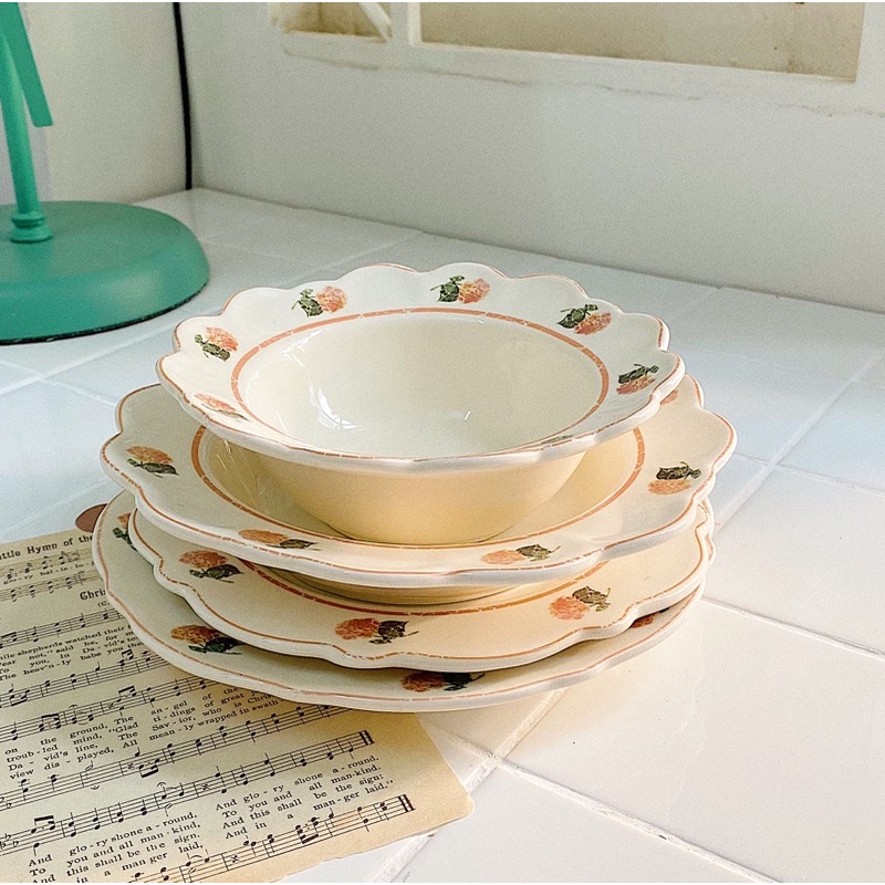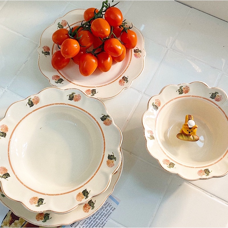 Chiếc đĩa ngà ngà viền đào siêu Vintage không thể thiếu cho các món tráng miệng còn đĩa sâu lòng có thể dùng đựng các món như mì ý, salad siêu dễ dàngSize: