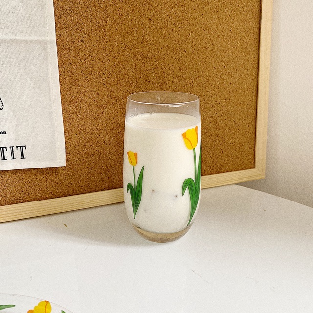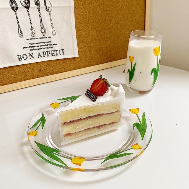 Yellow Tulip Set 💐Cả 1 set gồm đĩa thuỷ tinh và ly thuỷ tinh trong suốt hoạ tiết hoa Tulip vàng Vintage 🌞