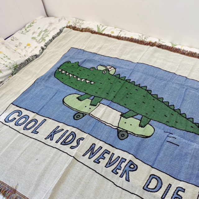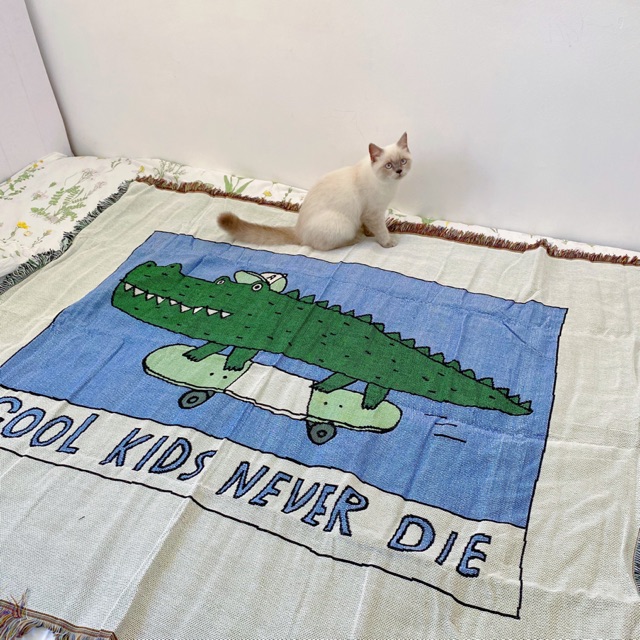 Chiếc thảm dệt Vintage Cool Kid Never Die cùng hoạ tiết em cá sấu lướt ván 🛹Size: 1,25m x 1,5m