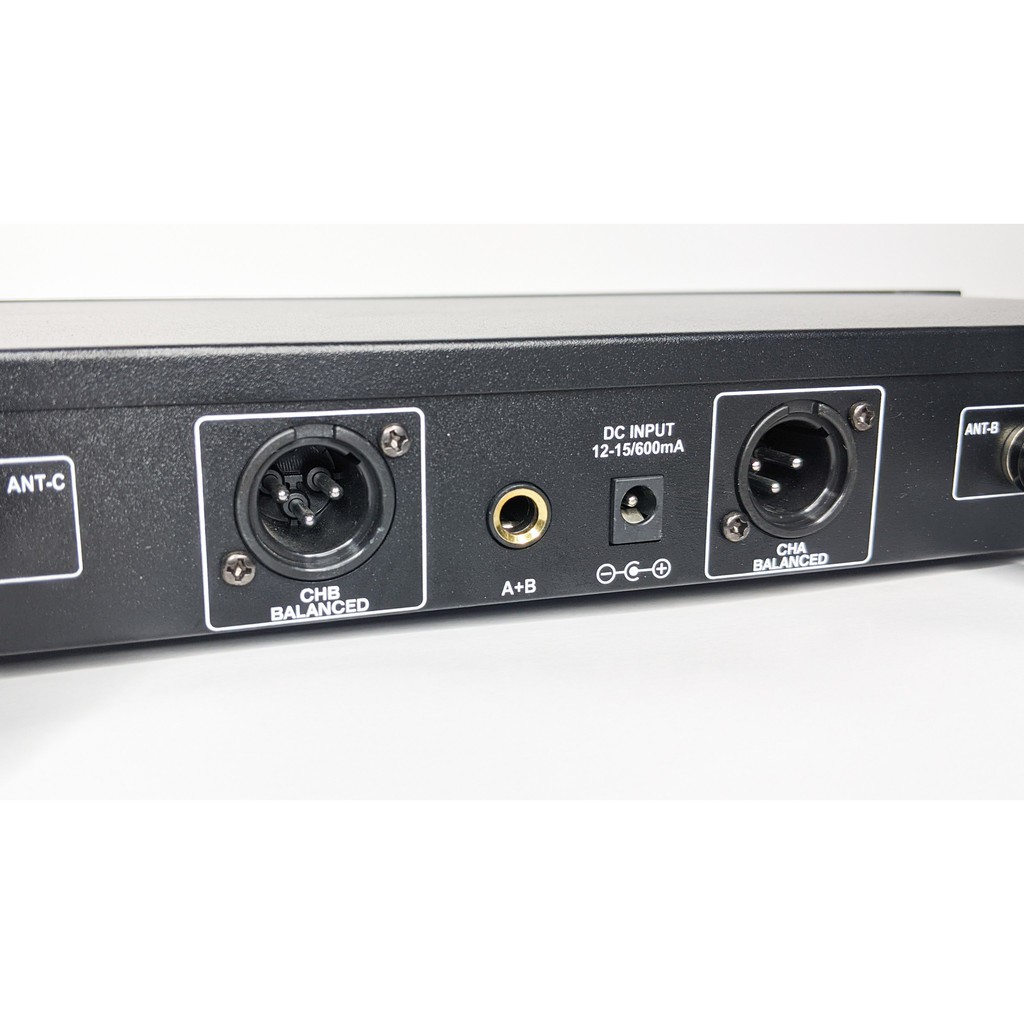 Song hành với sắc đen của micro là đầu thu với mặt trước có màu xám trắng tương phản rất bắt mắt, phù hợp với mọi không gian phòng khách. Bên cạnh đó là những thiết bị hỗ trợ như Adapter nguồn, dây kết nối với amply, 2 cặp pin tiểu và 4 ăng-ten thu nhận tín hiệu...