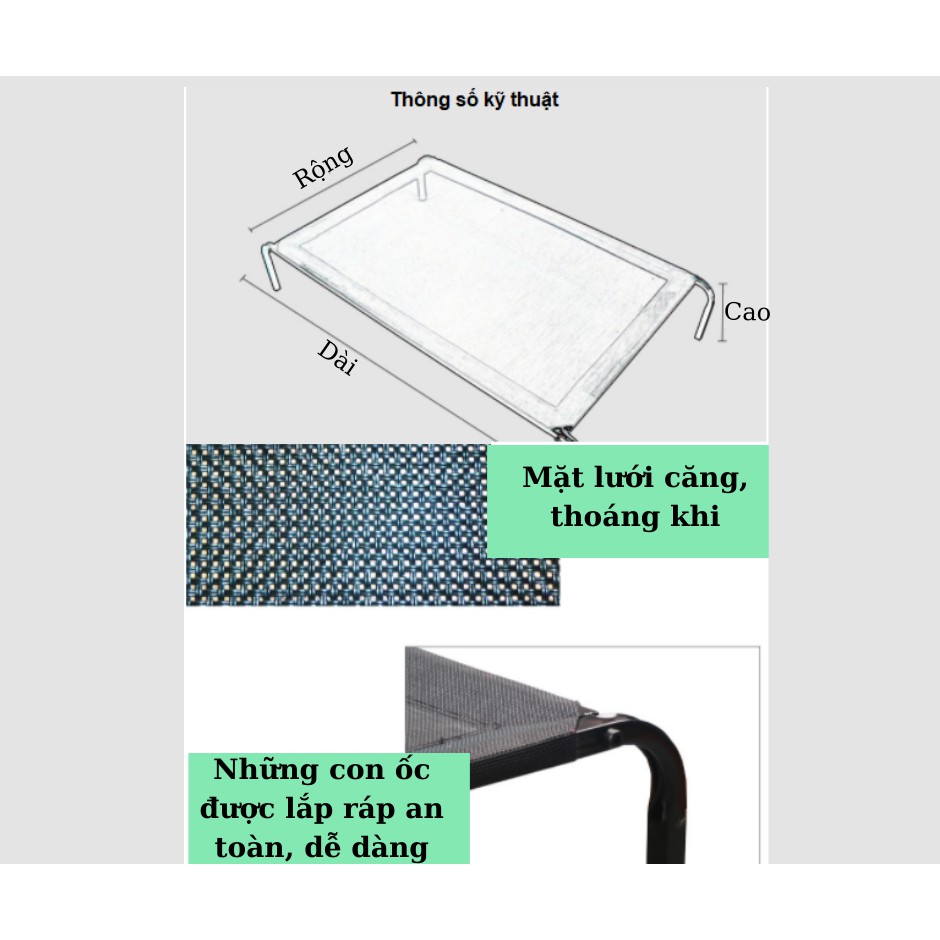 ✅MIÊU TẢGiường nâng thư giãn cho cún, phù hợp với cả 4 mùa. Giường với bề mặt lưới thoáng mát và khung thép chắc chắn, có thể chịu được trọng lượng lớn. Sản phẩm có thể tháo rởi và dễ dàng làm sạch