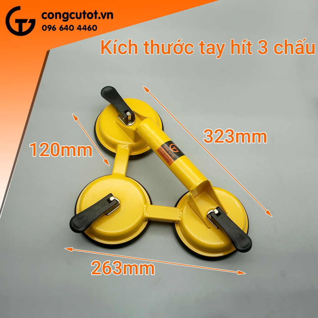Với tay hít kính 3 chấu bạn có thể dễ dàng hít, nâng nhấc tấm kính,gạch men, tấm đá ốp... một cách dễ dàng để thi công nhờ lực hút chân không tạo ra bởi 3 miếng cao su ở 3 chấu của tay hít và bề mặt sản phẩmHít và giữ được vật liệu lên tới 150kg