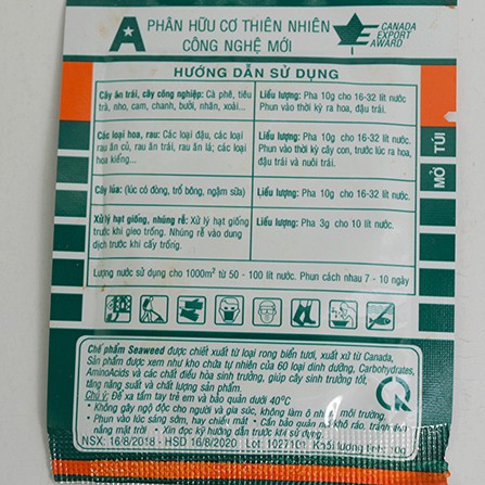 B: 125ppm; Fe: 200ppm; Mn: 10ppm; Cu: 30ppm; Zn: 65ppm; Cytokinin: 600ppm; Auxin: 37ppm; Gibberellin: 21ppm, Axit Amin (Alanin; Arginin; Threonin; Cystin; Serin; Glycin; Histidin; Valin; Isoleucin; Leucin; Lysin; Prolin; Methionin; Phenylalanin; Tyrosin; Tryptophan; Glutamic amic Axit; Aspartic Axit; Mannitol; Laminarin; Alginic Axit): 5,39%;