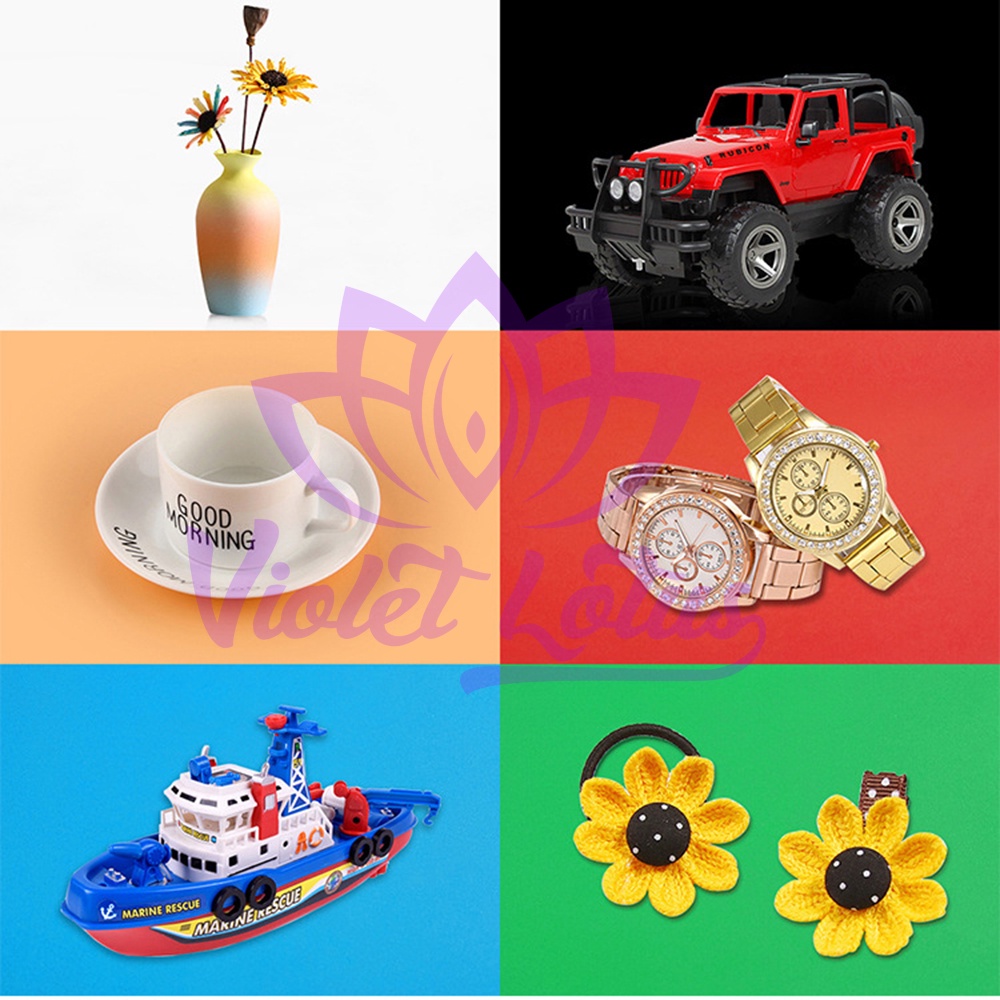 Phông nền tặng kèm hộp chụp ảnh: 6 tấm phông nền 2 mặt, gồm 12 màu