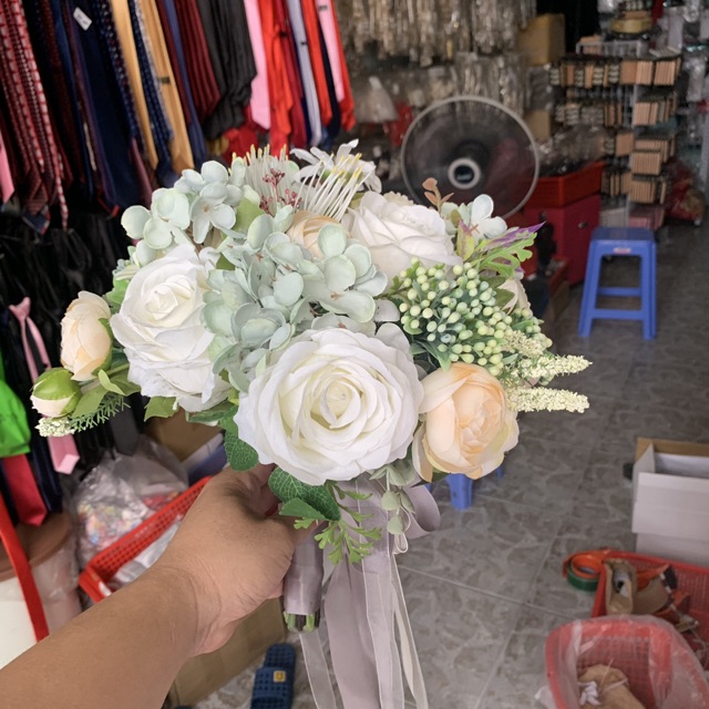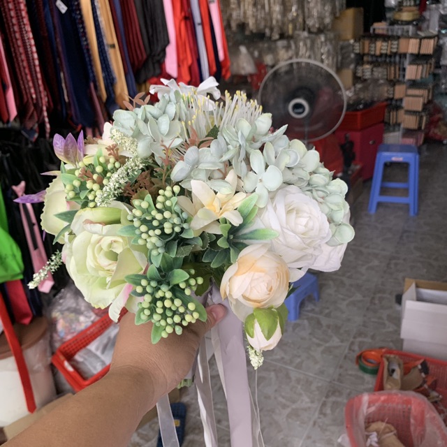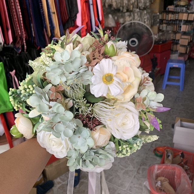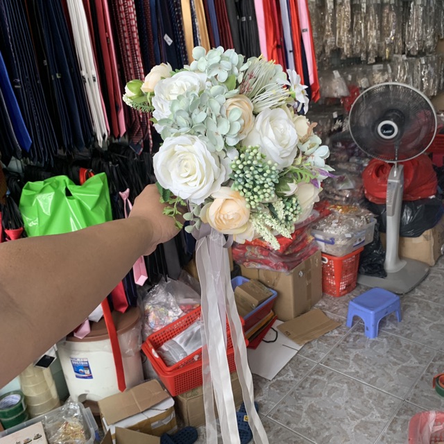 Nhà cửa & Đời sống > Trang trí nhà cửa > Hoa trang trí || Hoa cầm tay cô dâu bó tròn đính dây voan điệu đàCòn hàng